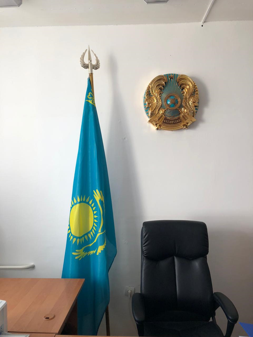 Қазақстан Республикасының мемлекеттік туы – ортасында шұғылалы күн, оның астында қалықтап ұшқан қыран бейнеленген тік бұрышты көгілдір түсті мата. Тудың сабының тұсында ұлттық өрнек тік жолақ түрінде нақышталған. Күн, оның шұғыласы, қыран және ұлттық өрнек бейнесі алтын түстес.